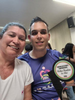 #pracegover João Arthur acompanhado pela Prof. Ana Maria e seus familiares João veste uniforme dos jogos estaduais, recebe premiação pelo destaque municipal.
